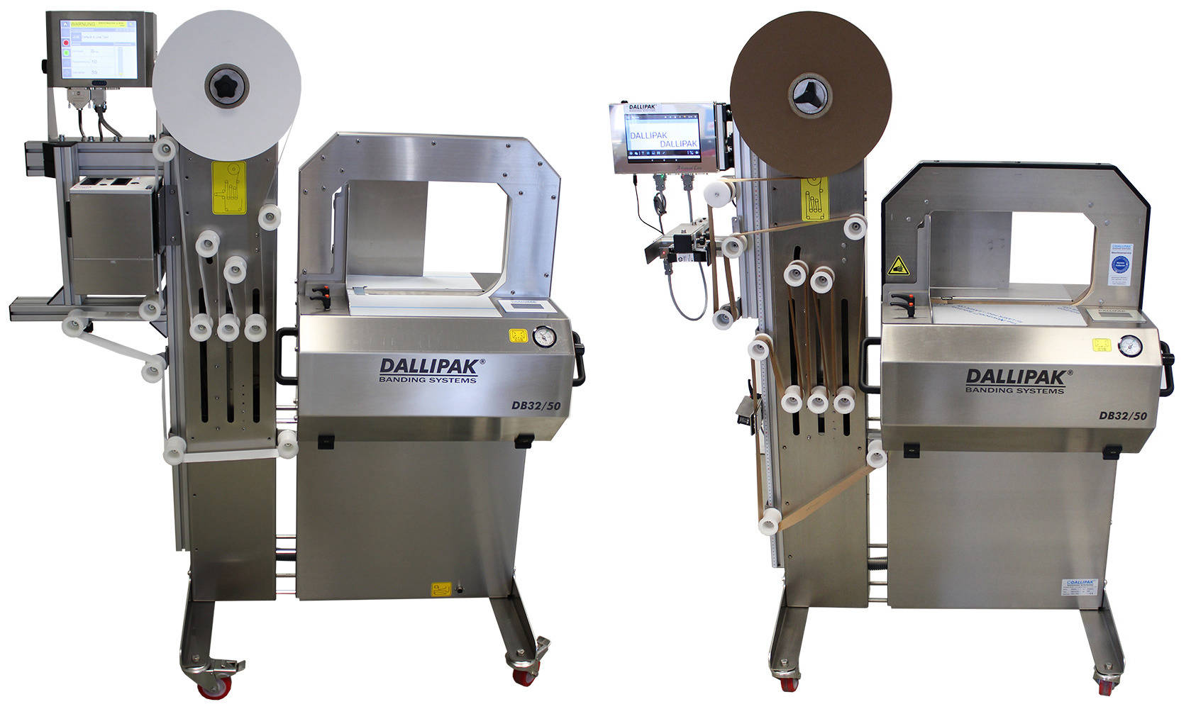Weiters lassen sich die Dallipak DB-Modelle einfach in (vorhandene) Transportanlagen integrieren. Diese Maschine ist auch das Basismodell für weitere Automatisation. Sehen Sie hierfür als Beispiel unsere automatischen Banderolieranlagen.